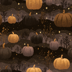 かぼちゃと星が舞う、ダークで幻想的な雰囲気のハロウィンシームレスパターンです。Preview